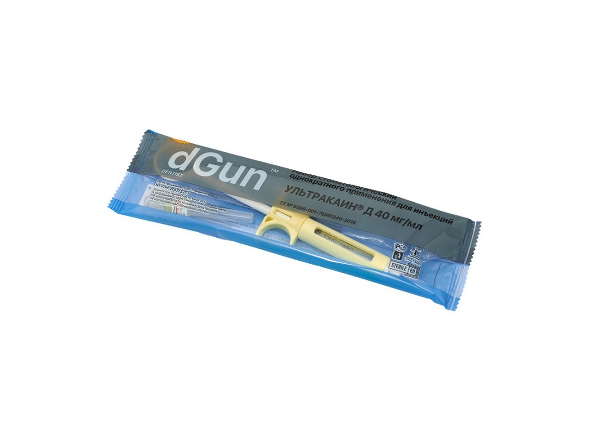 Одноразовый карпульный инъектор с анестетиком Ультракаин Д. Набор содержит одноразовый карпульный инъектор, стерильную иглу, лекарственное средство. Производитель: dGun, Россия.