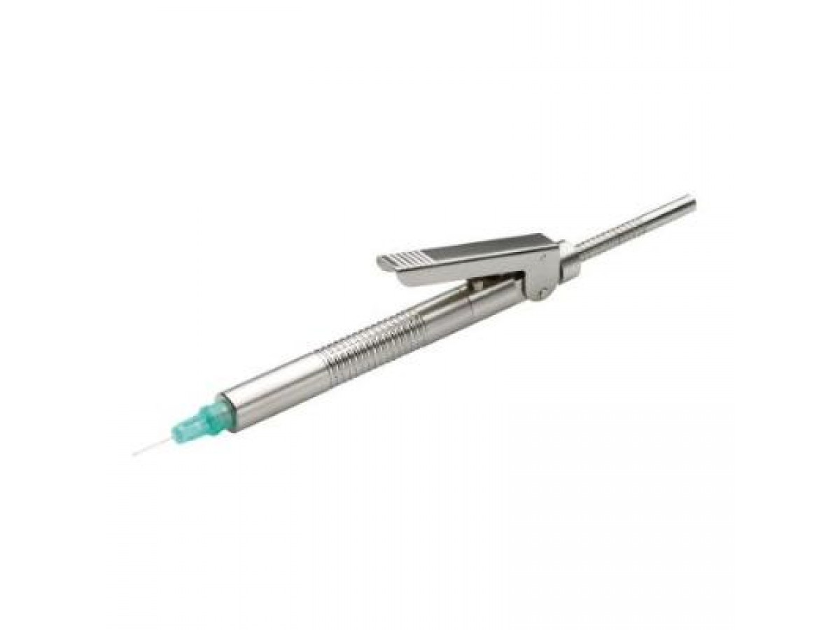 Шприц карпульный, интралигаментарный, прямой - металлический многоразовый шприц в форме авторучки, используется для введения анестетика в периодонтальную связку зуба (через мягкие ткани альвеолярного отростка к костным). Производитель: Medisporex, Пакистан.
