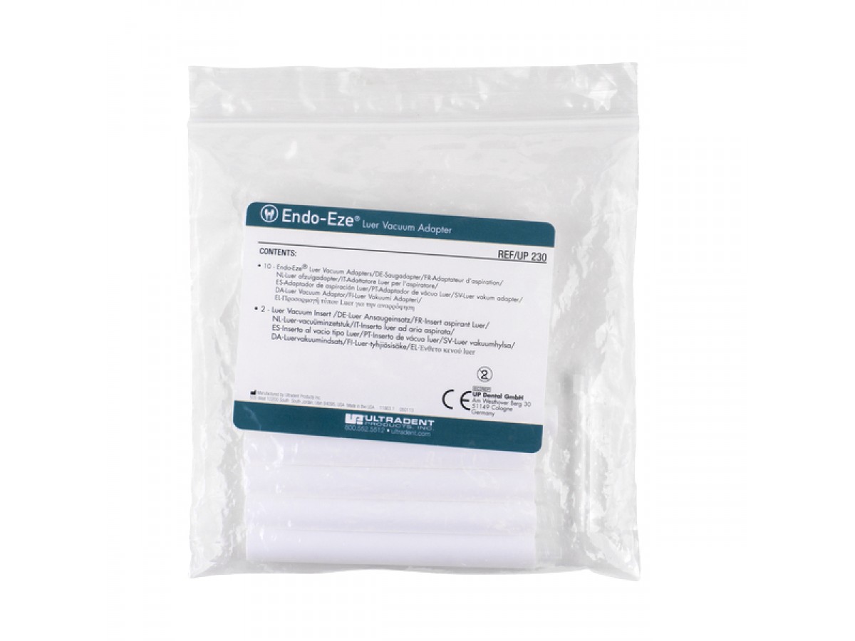Вакуумный адаптер Luer, Ultradent. Фиксируется вместо стандартного пылесоса на его разъем и имеет зажим типа Luer. К адаптеру фиксируются насадки (канюли), предназначенные для эвакуации растворов, быстрого и аккуратного высушивания полостей, контроля сухости операционного поля. Производитель: Ultradent, США.