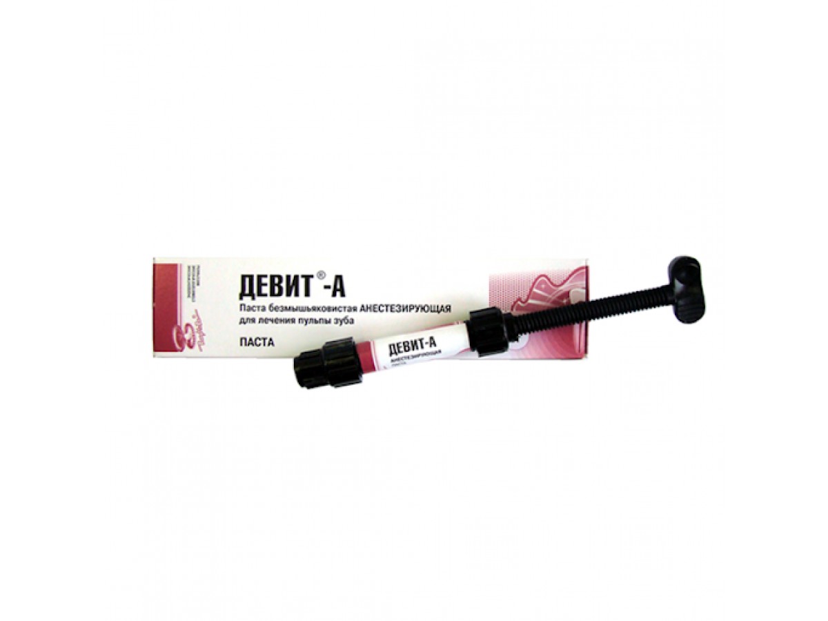 Стоматологическая паста «Девит-А» применяется как анестезирующий и антисептический компресс в случаях сильных болезненных реакций при лечении пульпита. Производитель: ВладМиВа, Россия.