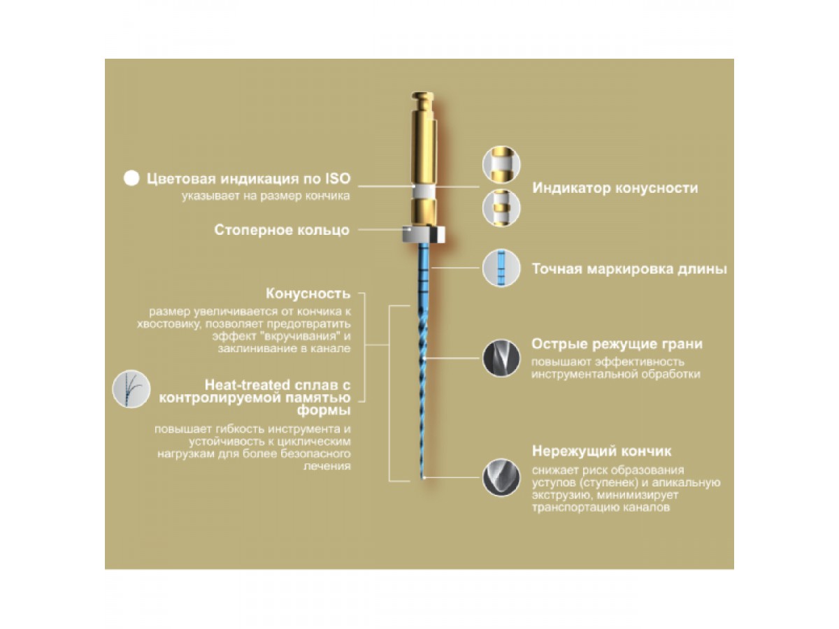- Безопасность: Резкое снижение рисков перфорации, транспортировки апекса или формирования ступеней благодаря неагрессивным кончикам и гибкости.