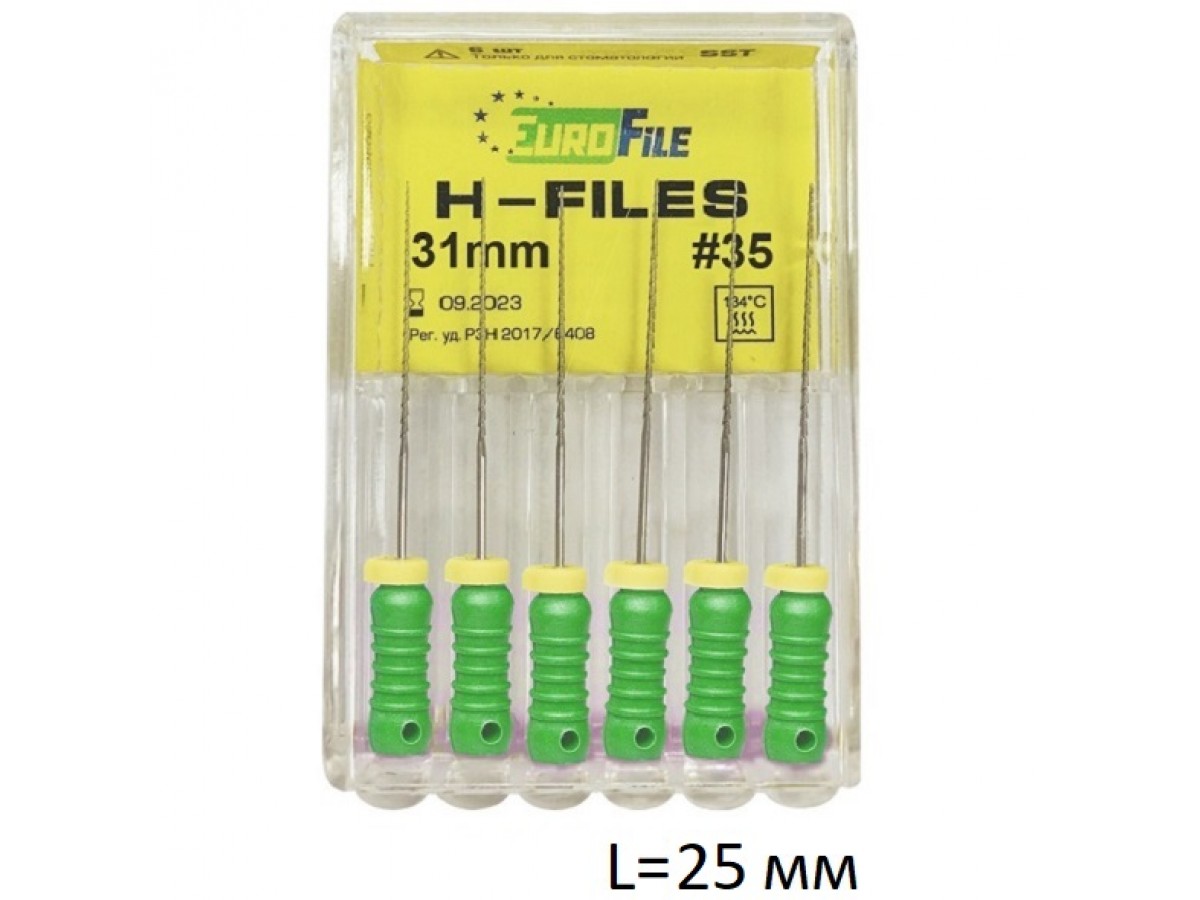 H-Files - ручной режущий стоматологический эндодонтический инструмент со спиральной нарезкой рабочей части. Материал рабочей режущей части - нержавеющая сталь, материал рукоятки – пластик (полибутилентерефталат). Производитель: EuroFile, КНР.