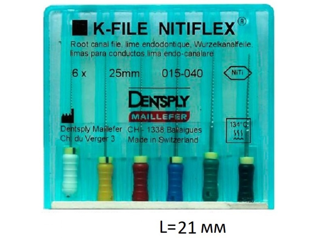 К-File Nitiflex — стоматологические инструменты повышенной гибкости. Производятся из сплава на основе никеля и титана и являются наиболее надежными инструментами для расширения и подготовки корневых каналов для дальнейшего пломбирования. Производитель: Dentsply Sirona, США.