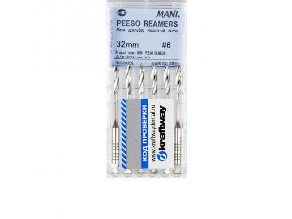 Peeso Reamers — это машинный режущий стоматологический эндодонтический инструмент со спиральной нарезкой рабочей части. Удлиненная рабочая часть представляет собой скрученные по спирали длинные плоские лезвия переходящие в жесткий, безопасный стержень. Производитель: Mani, Япония.