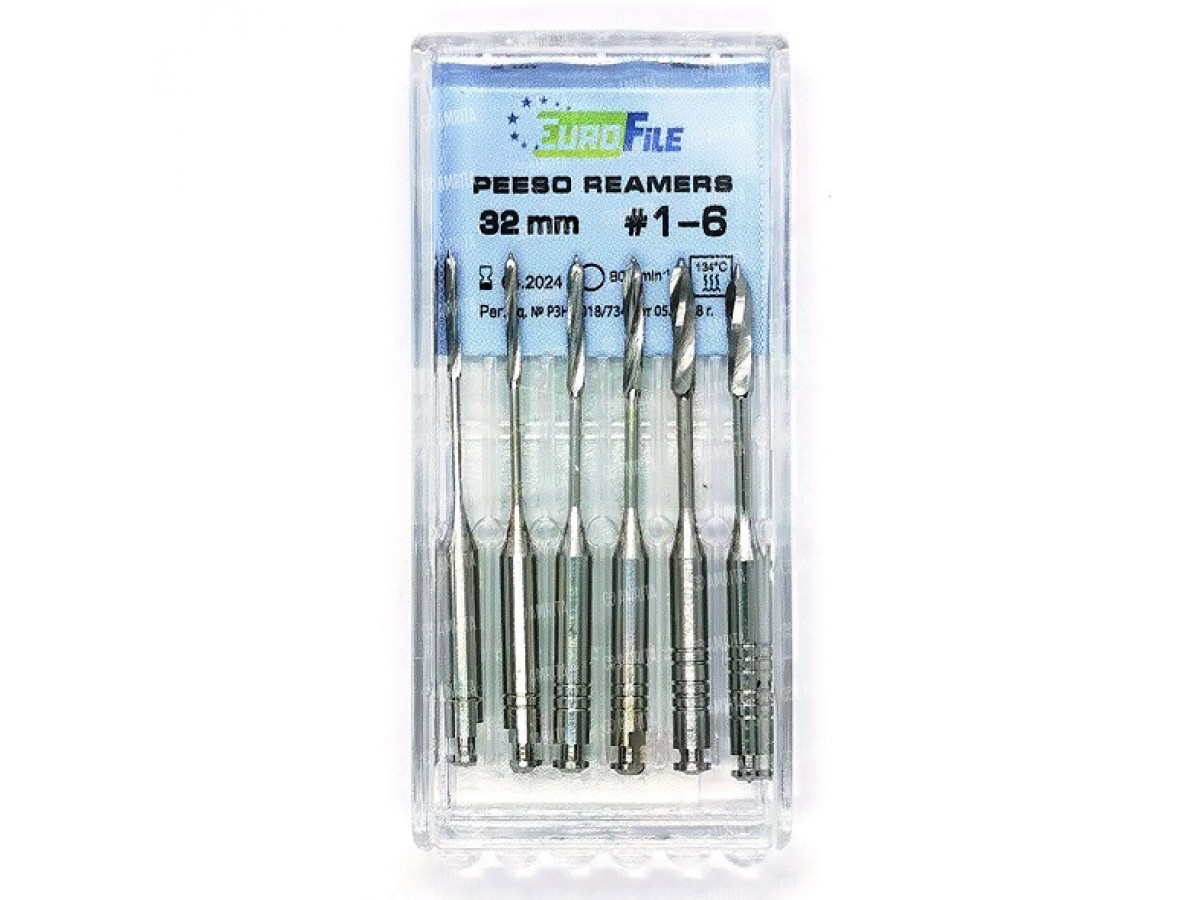 Peeso Reamers (Largo) - машинный режущий стоматологический эндодонтический инструмент со спиральной нарезкой рабочей части. Рабочая часть представляет собой скрученные по спирали длинные плоские лезвия с безопасным кончиком. Материал рабочей режущей части и хвостовика - нержавеющая сталь повышенной прочности. Производитель: EuroFile, КНР.