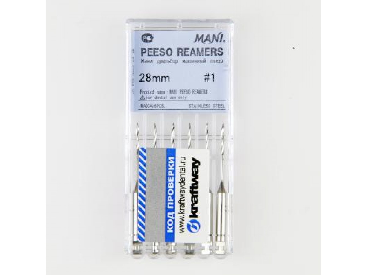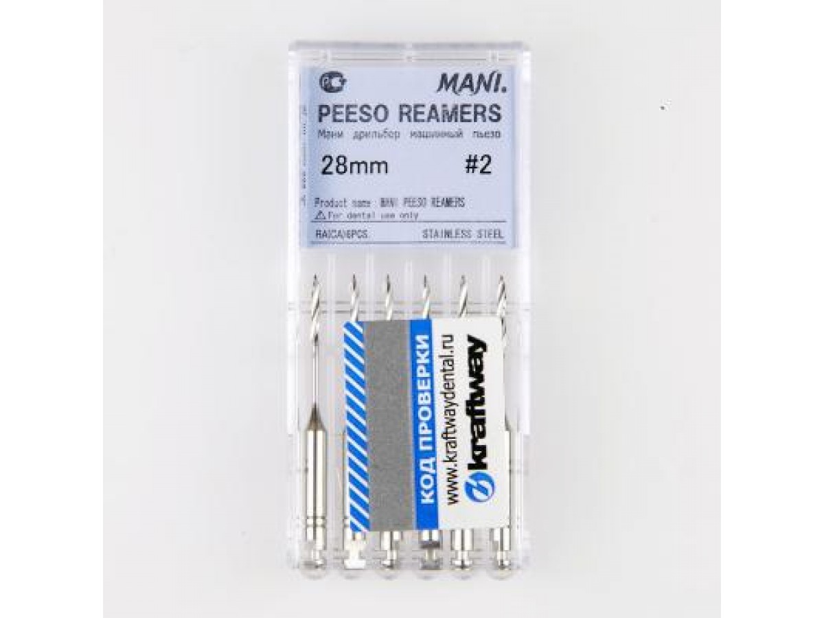 Peeso Reamers — это машинный режущий стоматологический эндодонтический инструмент со спиральной нарезкой рабочей части. Удлиненная рабочая часть представляет собой скрученные по спирали длинные плоские лезвия переходящие в жесткий, безопасный стержень. Производитель: Mani, Япония.
