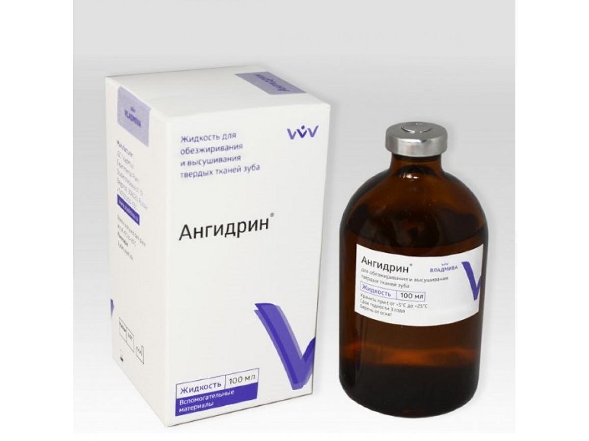 Ангидрин - предназначен для обезжиривания и высушивания твердых тканей зуба перед пломбированием или перед установкой несъемных протезов, а также для очистки протезных поверхностей перед фиксацией. Производитель: ВладМиВа, Россия.