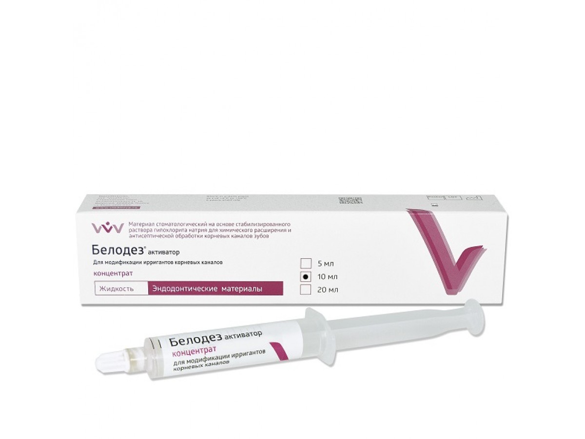 - Материал «Белодез» активатор предназначен для понижения поверхностного натяжения эндодонтических ирригантов: