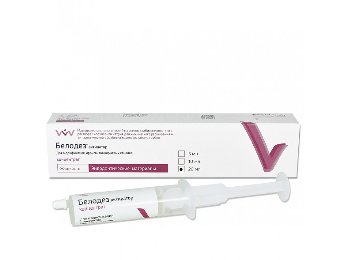 - Материал «Белодез» активатор предназначен для понижения поверхностного натяжения эндодонтических ирригантов: