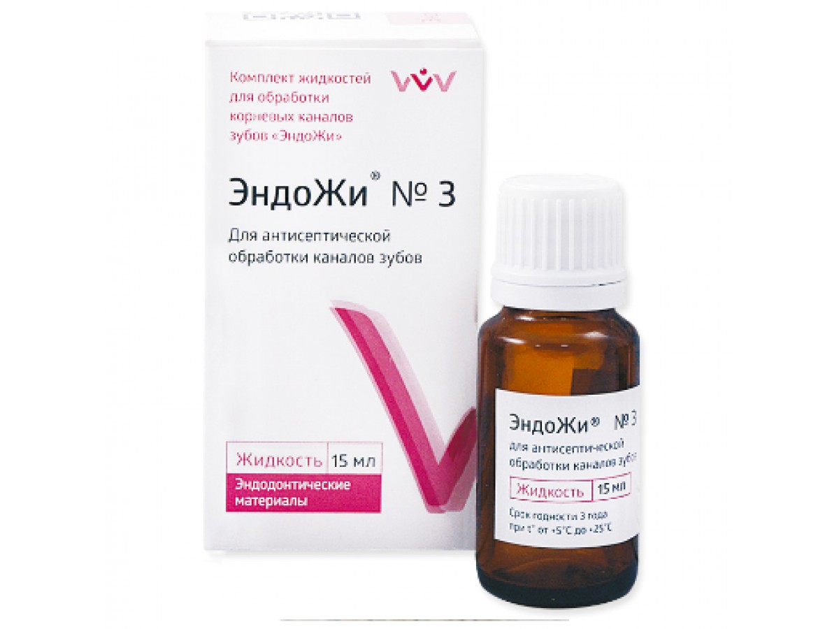 Эндожи №3 - для антисептической обработки инфицированных каналов зубов, содержащая глутаровый альдегид. Производитель: ВладМиВа, Россия.