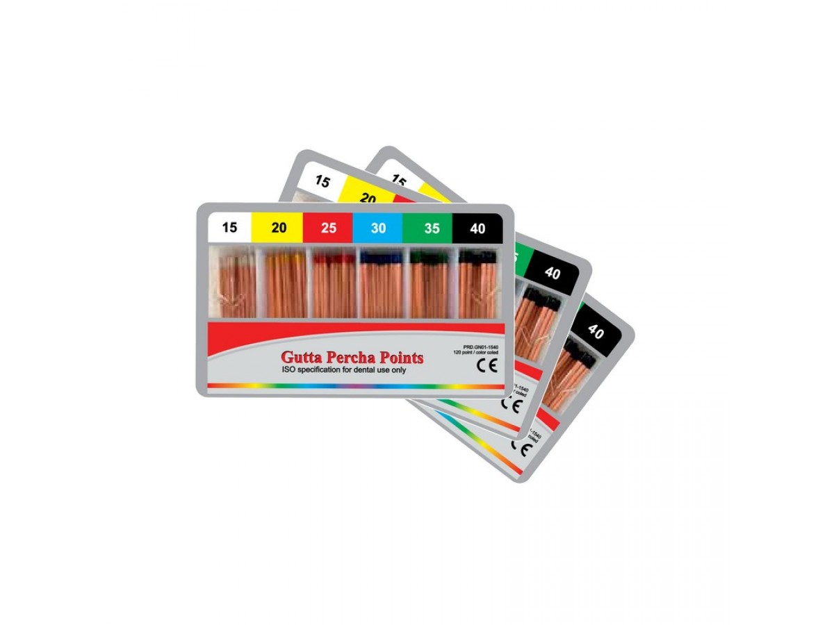 - Плотные штифты, сделанные из гомогенной, биосовместимой натуральной гуттаперчи.