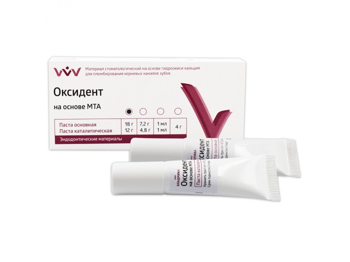- Материал стоматологический «Оксидент» на основе МТА, содержащий оксиды кальция, кремния, алюминия и дисалицилатную смолу «Оксидент» на основе МТА) предназначен для пломбирования корневых каналов зубов при лечении пульпита или апикального периодонтита.