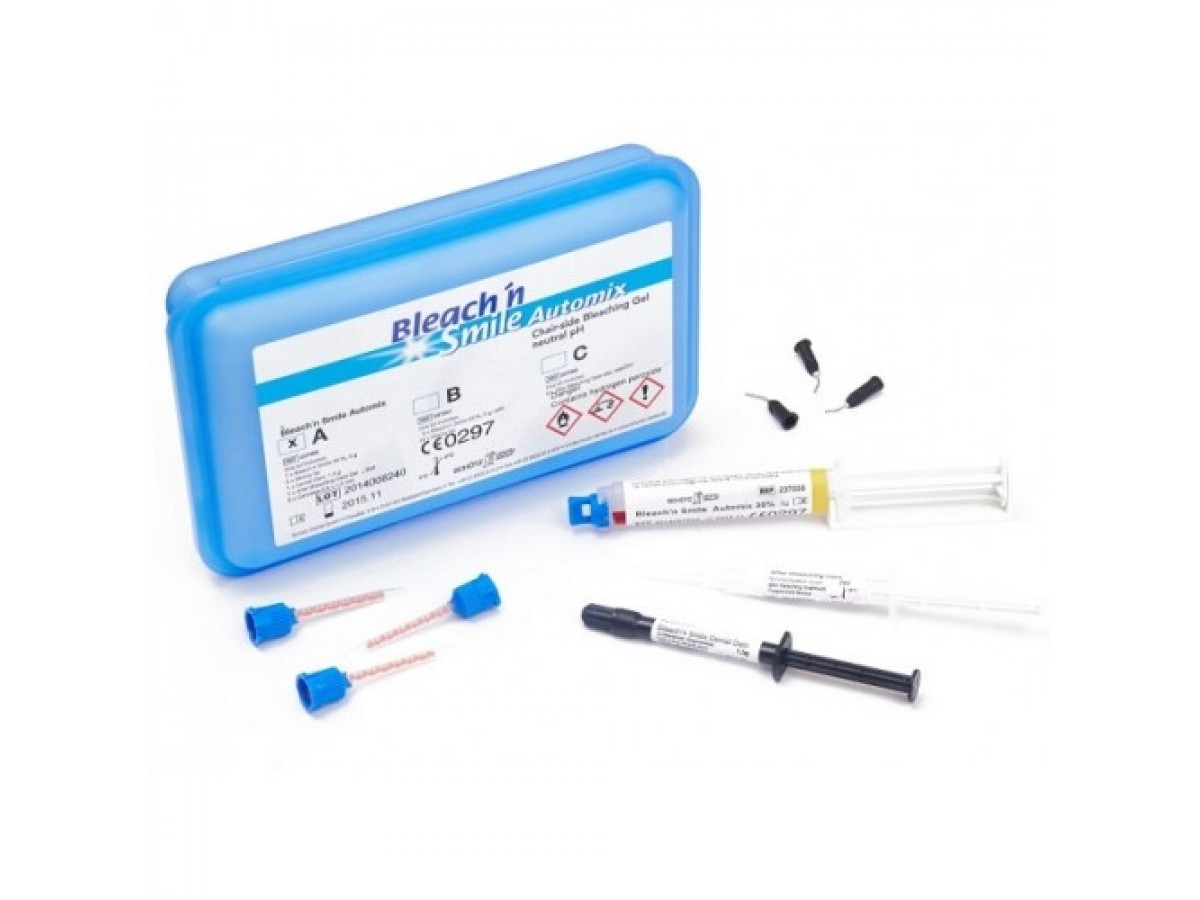Bleach`n Smile Automix – это простая и эффективная отбеливающая система, которая используется в кресле стоматолога. Двойной картридж удобен для мгновенного смешивания отбеливающего геля и активатора. Действующим агентом смешанного геля является 35% перекись водорода.