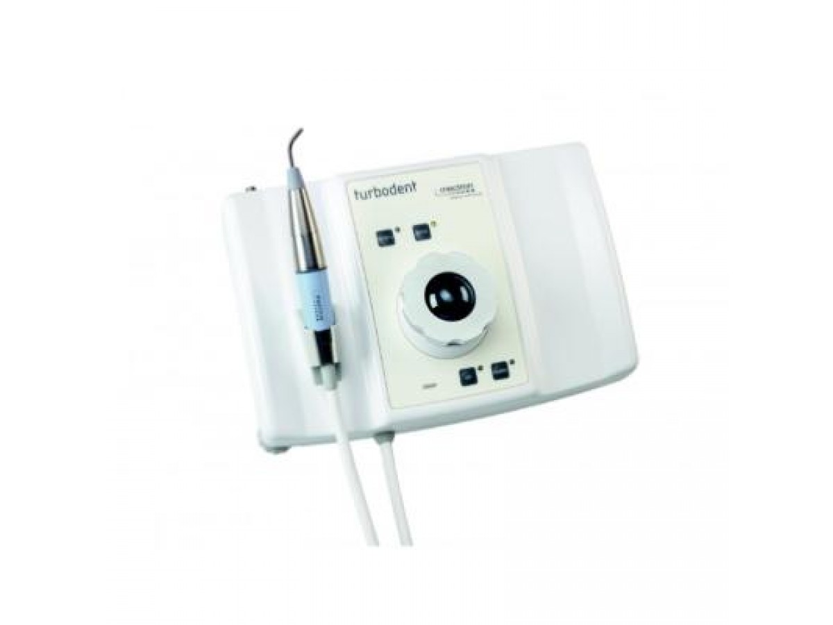 Turbodent — это автономный аппарат для пескоструйной полировки зубов. Имеет перио (perio) поддесневой режим сниженного давления подачи порошка. Аппарат позволяет использовать как бикарбонатный порошок для классической полировки поверхности зуба, так и порошок на основе глицина для щадящей обработки около десны. Производитель: Mectron, Италия.