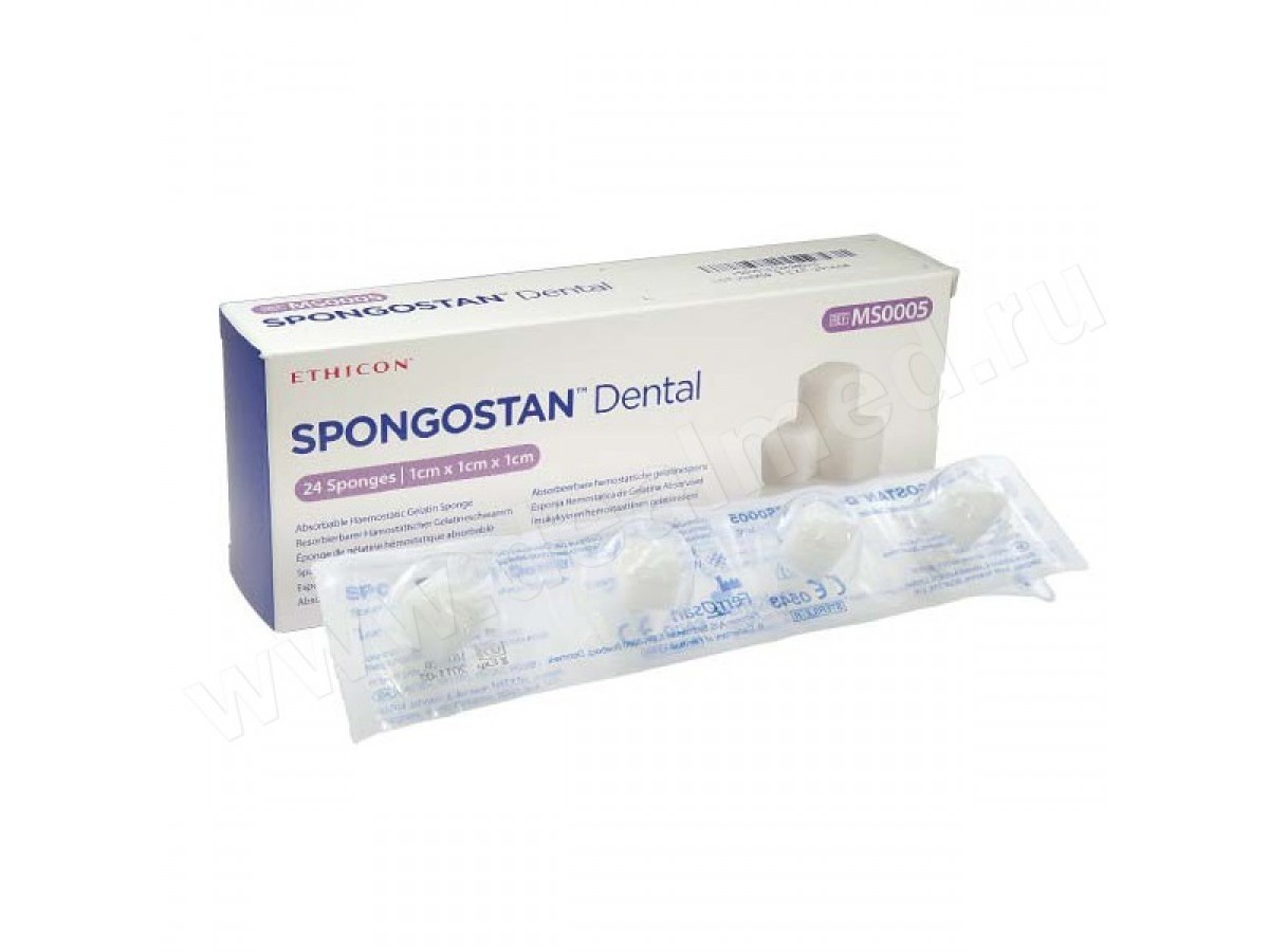 Стерильная, пластично рассасывающаяся губка «Спонгостан», не способная растворяться в воде, изготовлена на основе животного желатина. Основным назначением данного изделия является остановка кровотечения в стоматологической практике на различных раневых участках органических тканей ротовой полости. Цвет губки практически белый, консистенция пористая. Производитель: ETHICON, США.