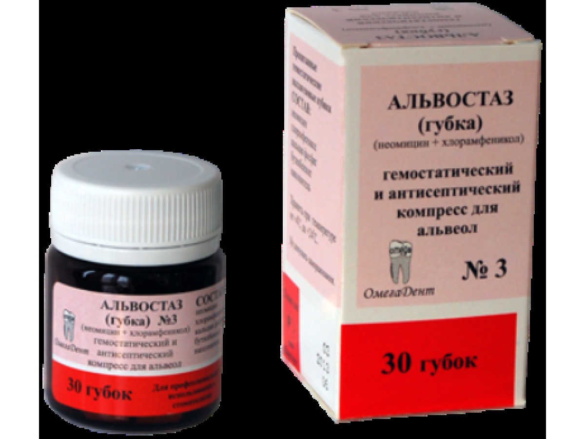 Губка «Альвостаз» — это гемостатические коллагеновые кубики размером 1х1см пропитанные соответствующим раствором, для профилактики и лечения альвеолита, обладает свойством полностью рассасываться. Производитель: Омега-Дент, РФ.