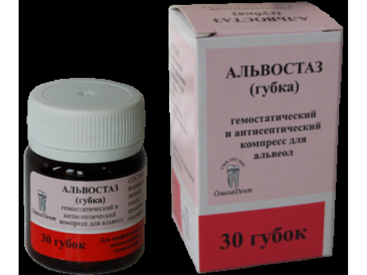 Губка «Альвостаз» — это гемостатические коллагеновые кубики размером 1х1см пропитанные соответствующим раствором, для профилактики и лечения альвеолита, обладает свойством полностью рассасываться. Производитель: Омега-Дент, РФ.