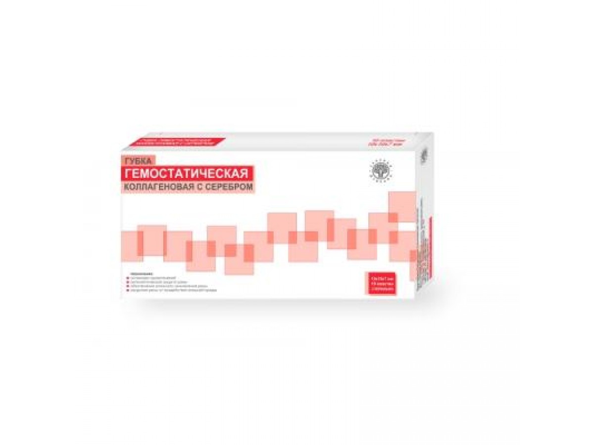 Губка гемостатическая коллагеновая с серебром, предназначена в качестве местного гемостатического средства и раневого покрытия с антисептическими свойствами для остановки кровотечений, закрытия ран от воздействия внешней среды и обеспечения влажного заживления ран. Производитель: Инновационные коллагеновые биоматериалы, Россия.