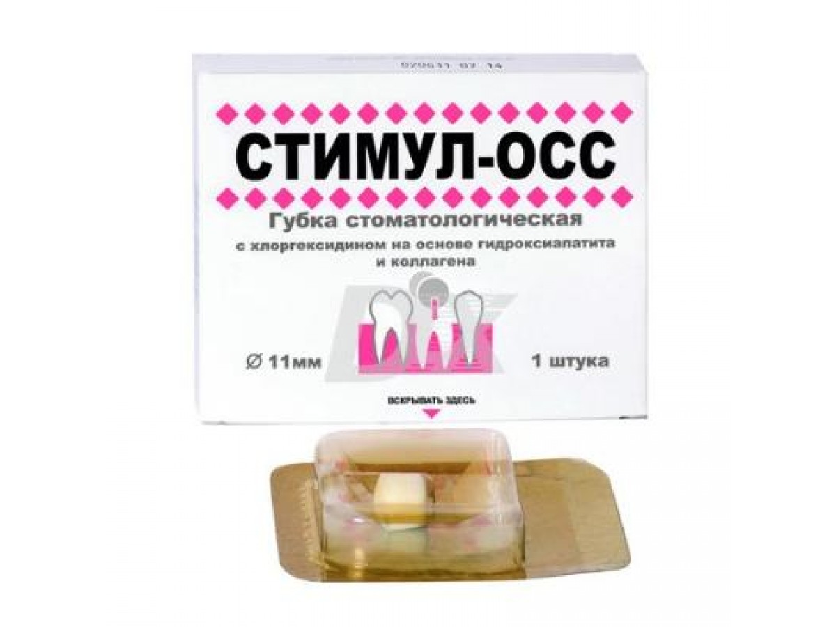 Губка стоматологическая гемостатическая «Стимул Осс» является уникальной. Коллагеновая губка соприкасаясь с раневой поверхностью, вызывает стимуляцию роста соединительной ткани, т.е. заживление раны. Производитель: "Лужский завод "Белкозин", РФ.