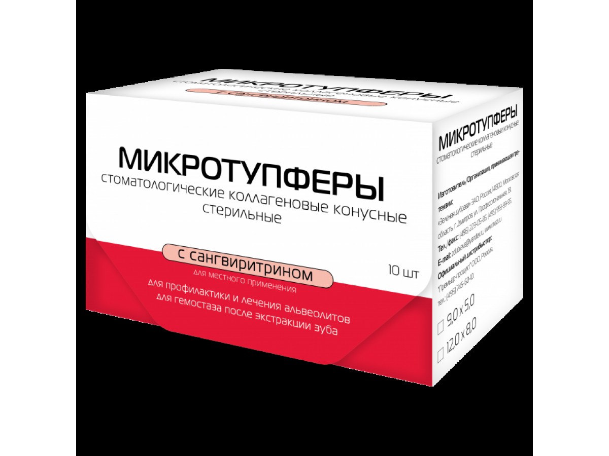 - Микротупферы стоматологические коллагеновые конусные с сангвиритрином 10 штук, каждый в отдельной стерильной упаковке, помещенной в картонную пачку.