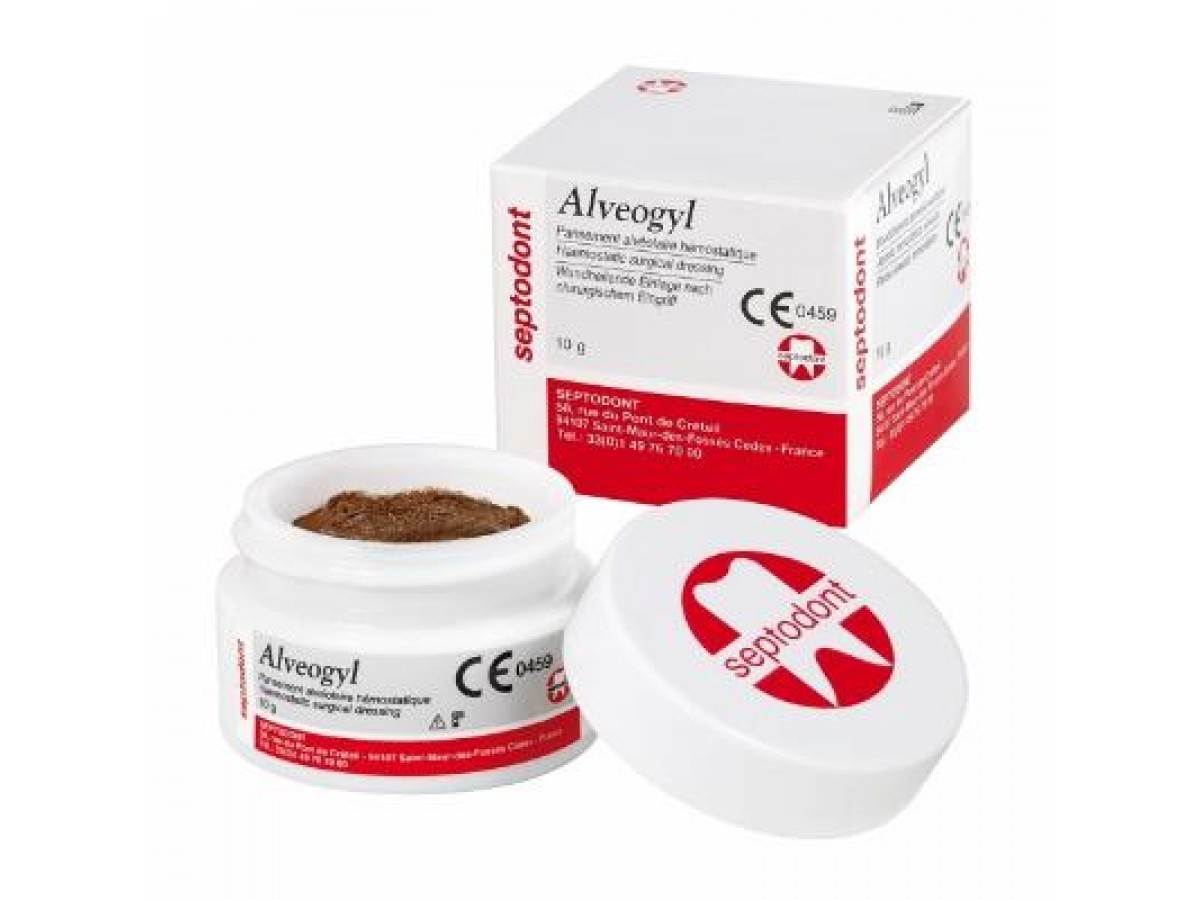 Alveogyl — это паста, применяемая для повязок при сухой лунке и для повязок на место удаленного зуба у пациентов с травматическим удалением зуба и осложнением сухой лунки. Производитель: Septodont, Франция.
