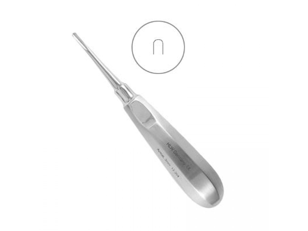 Элеватор Apical 3 мм, №13-304 для удаления корней зубов верхней челюсти, атипично расположенных зубов верхней челюсти и, в ряде случаев, для удаления третьих моляров нижней челюсти. Производитель: HLW Dental Instruments, Германия.
