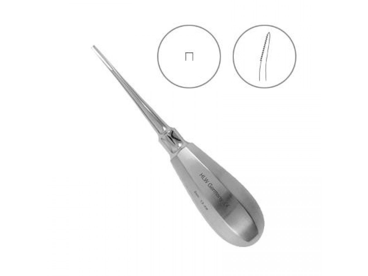 Элеватор конструкции Бейна, зубчатый, изогнутый, 2 мм, №13-6BCZ для удаления корней и зубов на верхней и нижней челюсти. Производитель: HLW Dental Instruments, Германия.