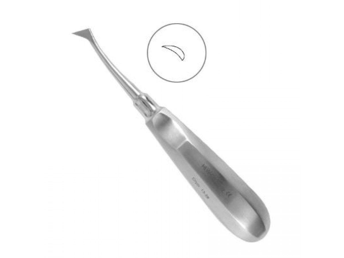 - Щечка изогнутого инструмента имеет треугольную форму и заостренный край. Рабочая часть элеватора вводится в лунку зуба или корня и путем вращения рукоятки инструмента по или против хода часовой стрелки осуществляется вывихивание зуба.