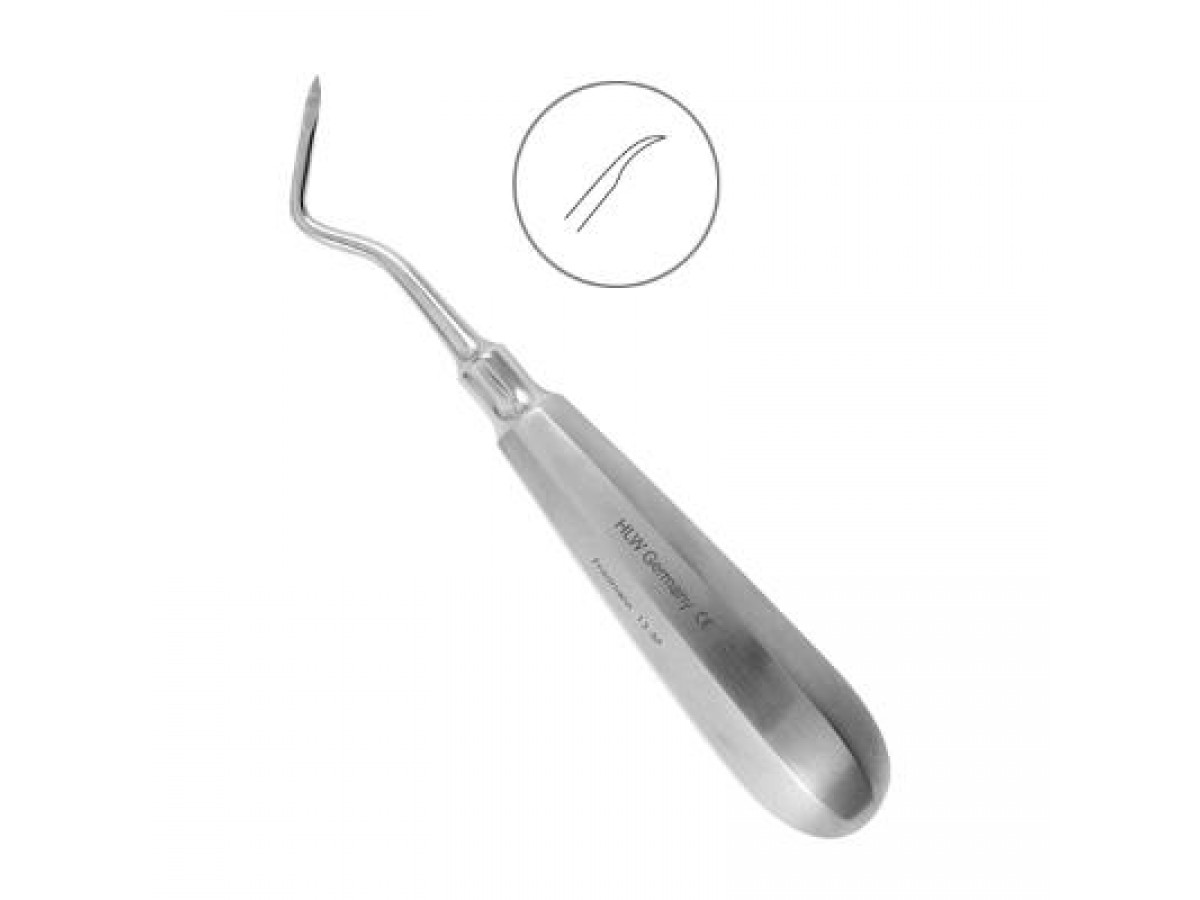 Элеватор Friedmann, изогнутый от себя, 3 мм, №13-5F, предназначен для удаления корней зубов на нижней челюсти, а также удаления нижнечелюстных дистопированных зубов и зубов с разрушенной коронковой частью. Производитель: HLW Dental Instruments, Германия.