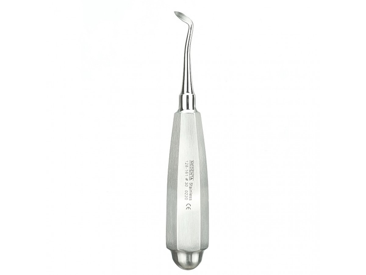 128-161-30-P Элеватор корневой (угловой левый, флажок узкий). Ручной штыковой стоматологический инструмент для люксации и удаления зуба, состоящий из рабочей части, стержня и ручки для захвата. Производитель: Medenta Instrumets Co., Пакистан.