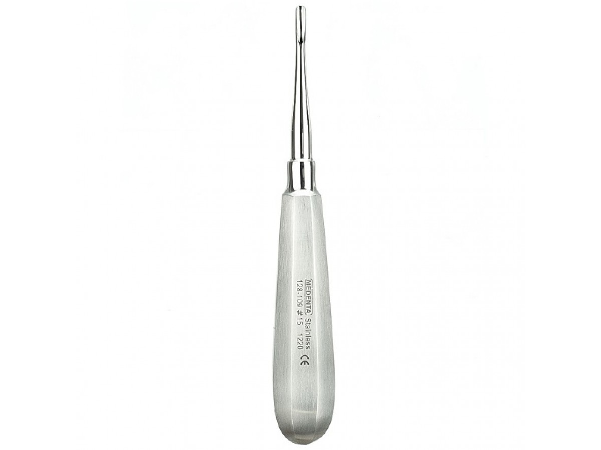 128-109-15 Элеватор корневой (прямой, широкий). Ручной штыковой стоматологический инструмент для люксации и удаления зуба, состоящий из рабочей части, стержня и ручки для захвата. Производитель: Medenta Instrumets Co., Пакистан.