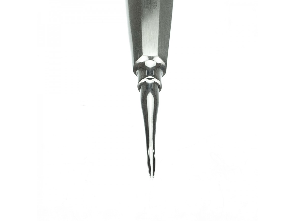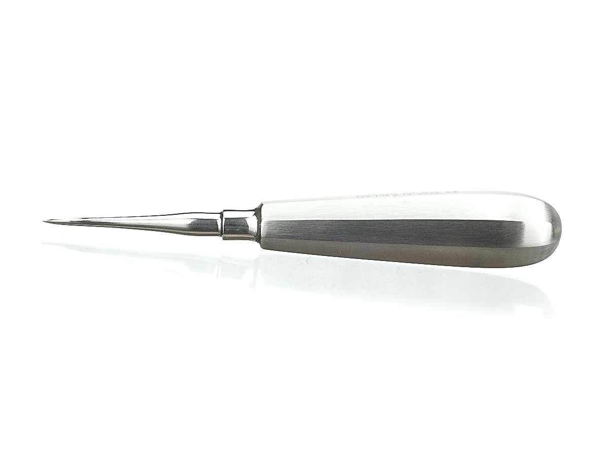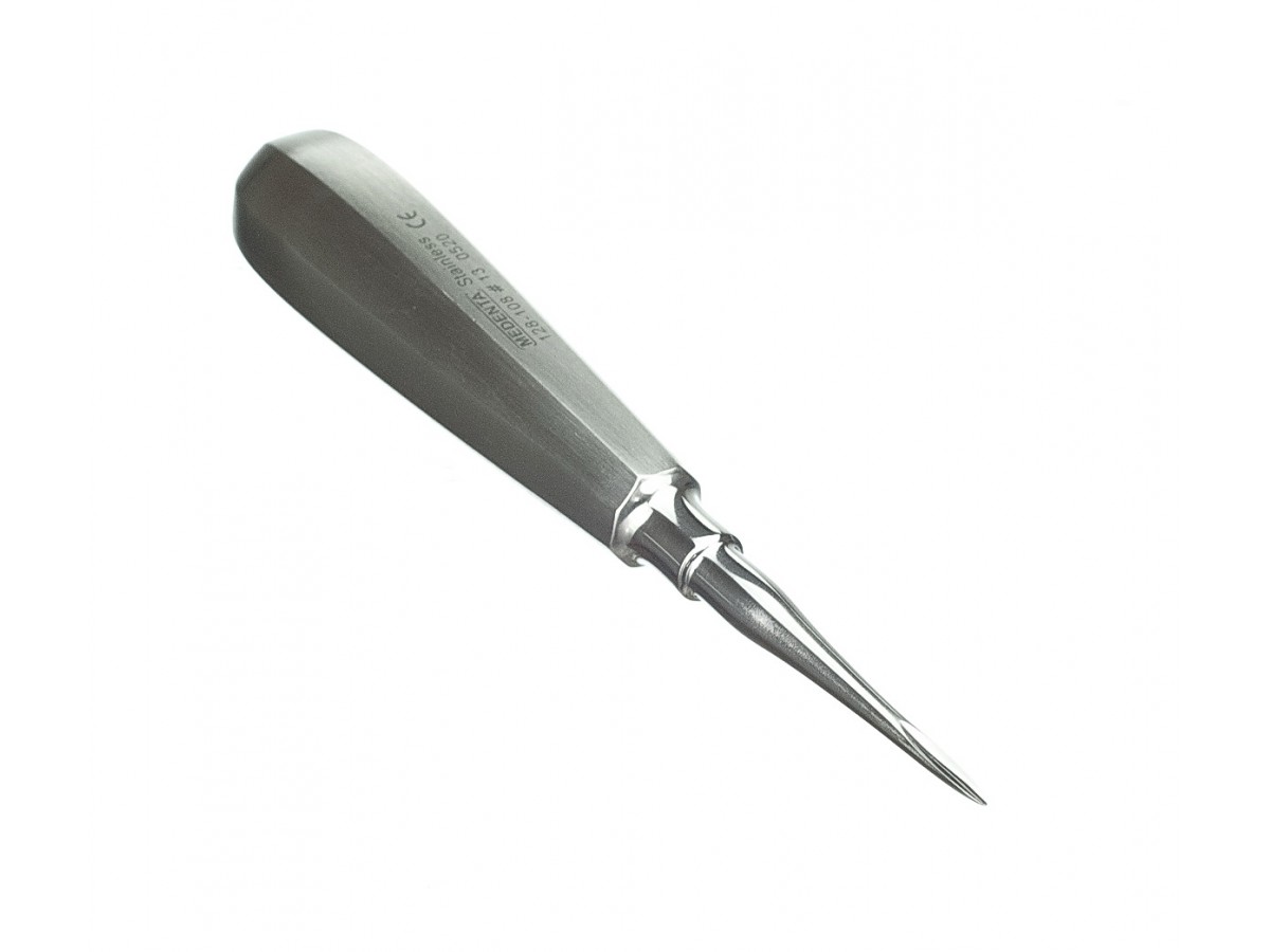 128-108-13 Элеватор корневой (прямой, узкий). Ручной штыковой стоматологический инструмент для люксации и удаления зуба, состоящий из рабочей части, стержня и ручки для захвата. Производитель: Medenta Instrumets Co., Пакистан.