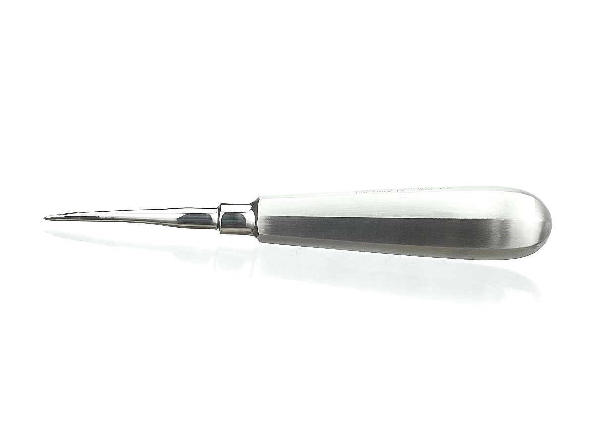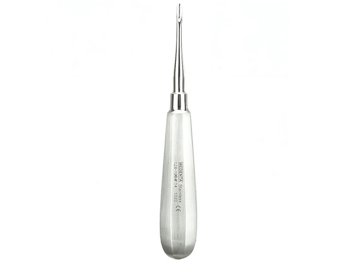 128-109-14 Элеватор корневой (прямой, узкий). Ручной штыковой стоматологический инструмент для люксации и удаления зуба, состоящий из рабочей части, стержня и ручки для захвата. Производитель: Medenta Instrumets Co., Пакистан.