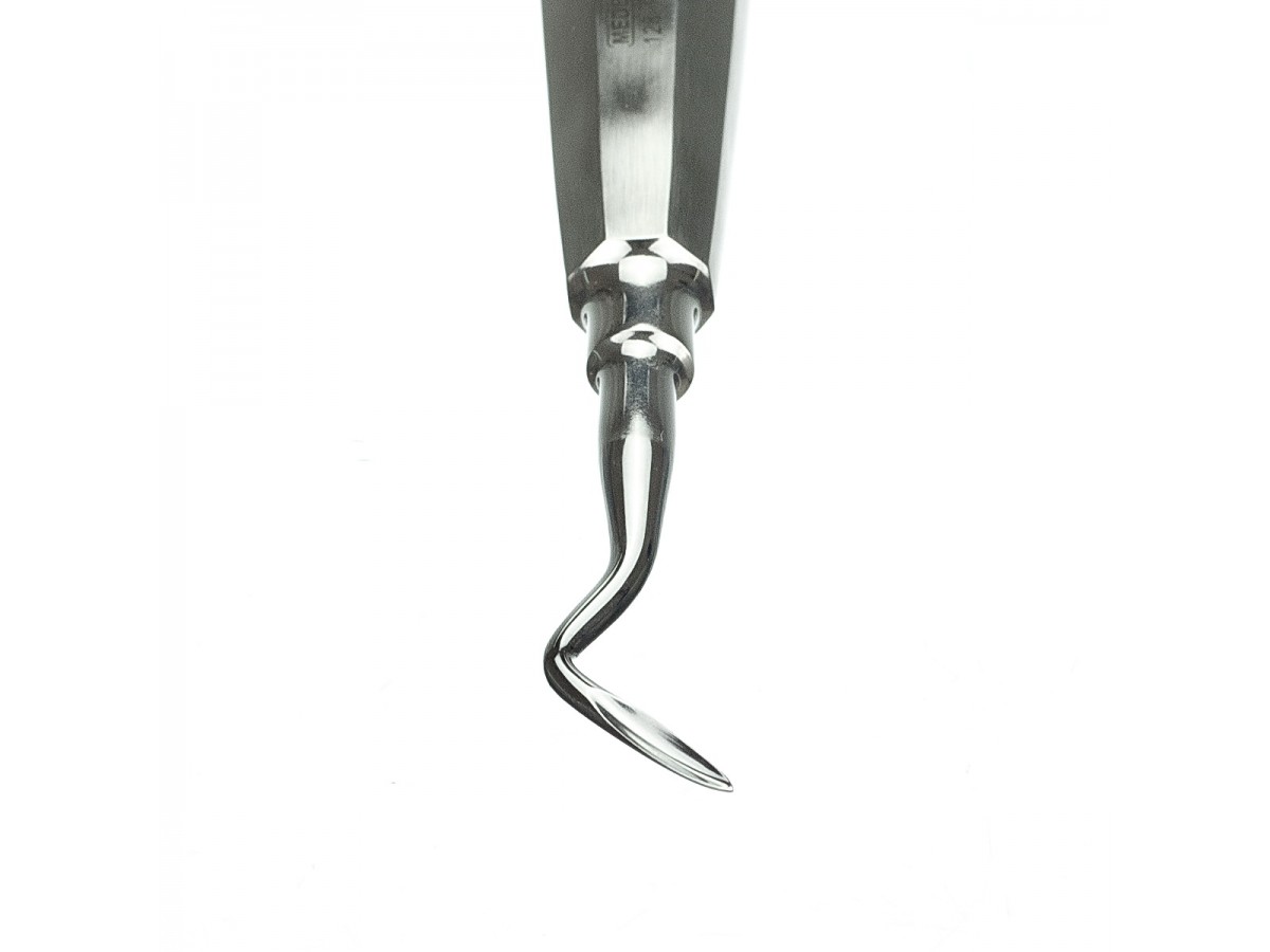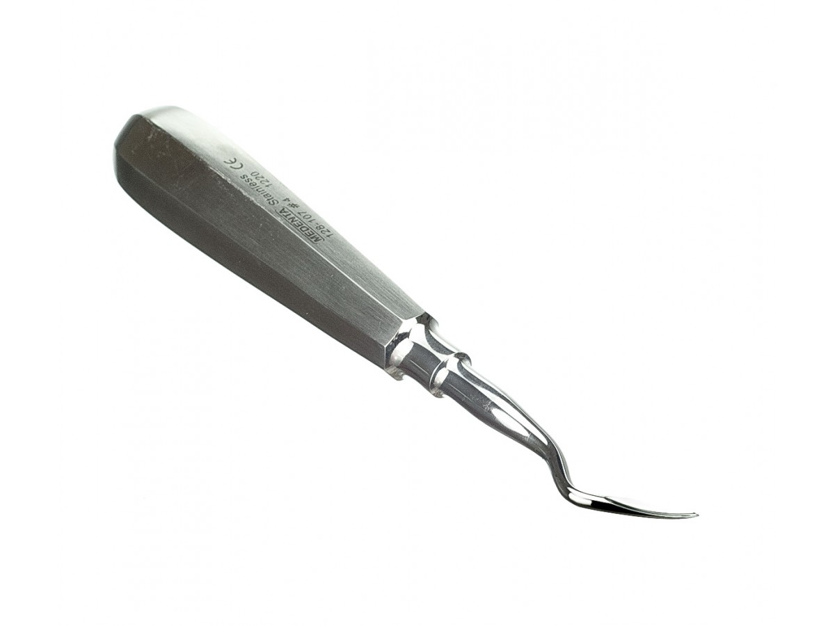 128-107-4 Элеватор корневой (угловой, левый). Ручной штыковой стоматологический инструмент для люксации и удаления зуба, состоящий из рабочей части, стержня и ручки для захвата. Производитель: Medenta Instrumets Co., Пакистан.