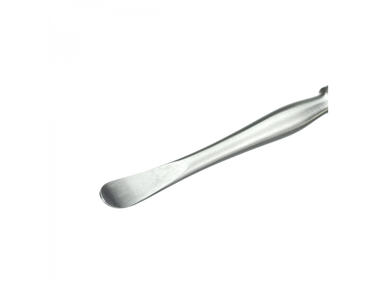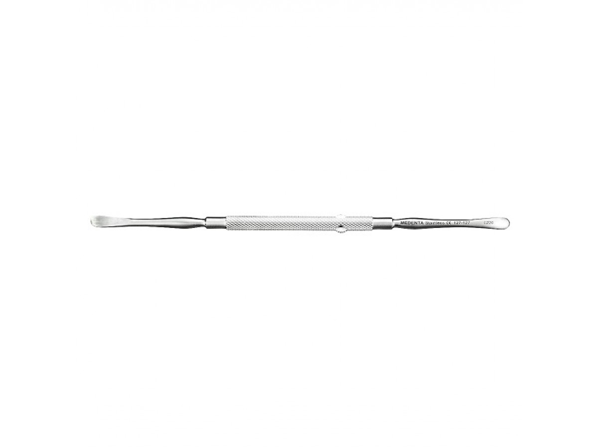 127-127-P Элеватор периостальный двухсторонний (изогнутый, тупоконечный/остроконечный). Ручной штыковой стоматологический инструмент для люксации и удаления зуба, состоящий из рабочей части, стержня и ручки для захвата. Производитель: Medenta Instrumets Co., Пакистан.