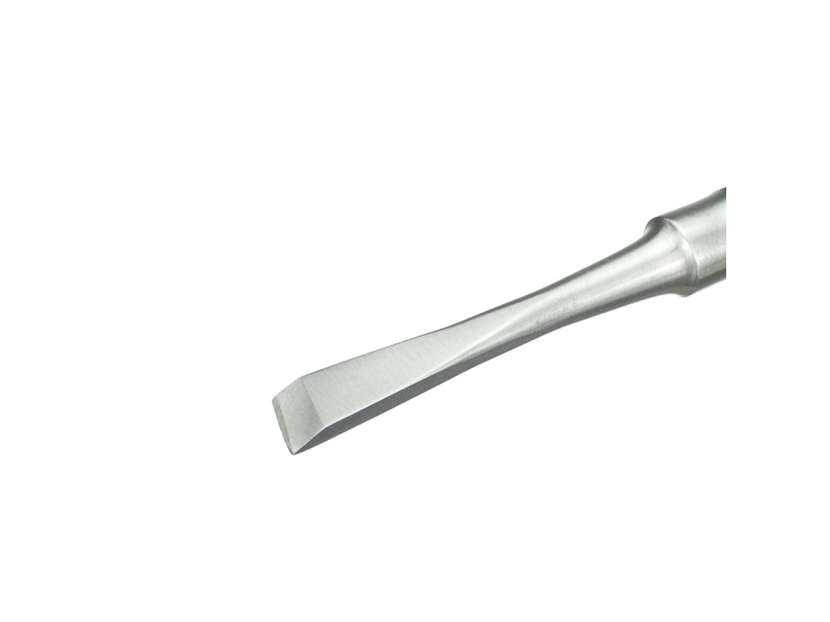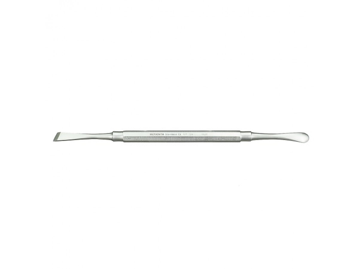 127-124-P Элеватор периостальный двухсторонний (прямой/угловой, тупоконечный/остроконечный). Ручной штыковой стоматологический инструмент для люксации и удаления зуба, состоящий из рабочей части, стержня и ручки для захвата. Производитель: Medenta Instrumets Co., Пакистан.