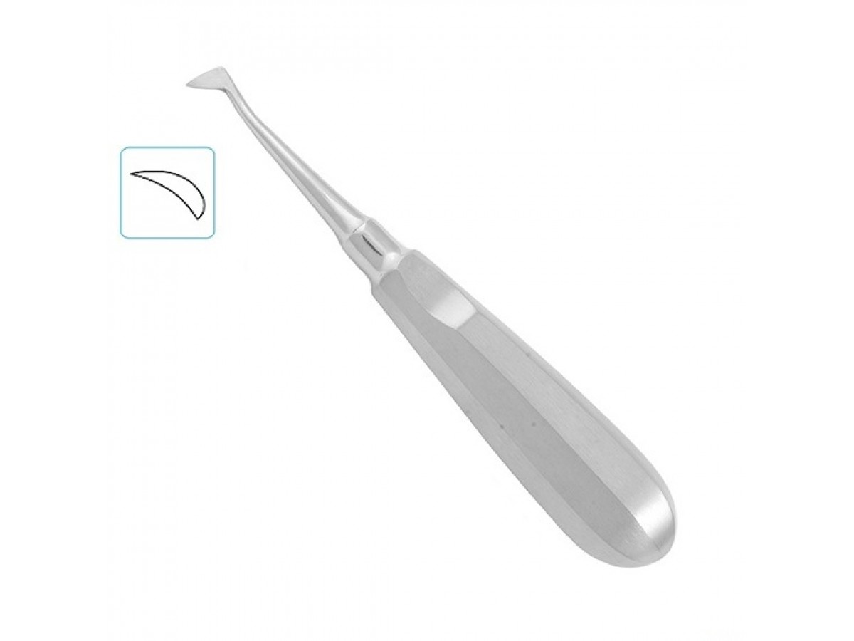 Элеватор зубной угловой, правый флажок под 90 градусов используется для удаления зубов и их корней. Рабочая часть изогнутая. Производитель: Sammar, Пакистан.