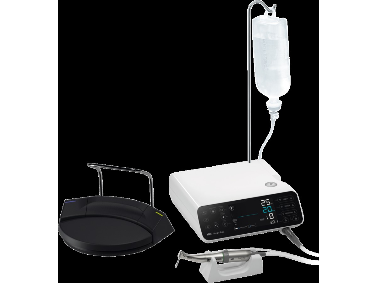 Физиодиспенсер Surgic Pro в комплекте с наконечником с оптикой Ti-Max SG20L (понижение 20:1). С блоком управления с улучшенной функцией калибровки крутящего момента под нагрузкой и без. Производитель: NSK Nakanishi, Япония.
