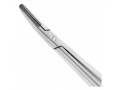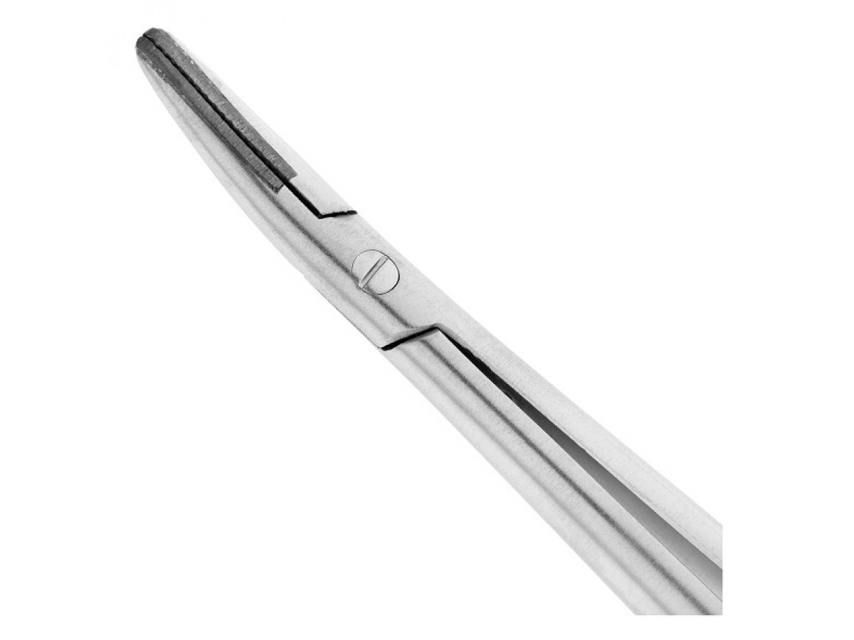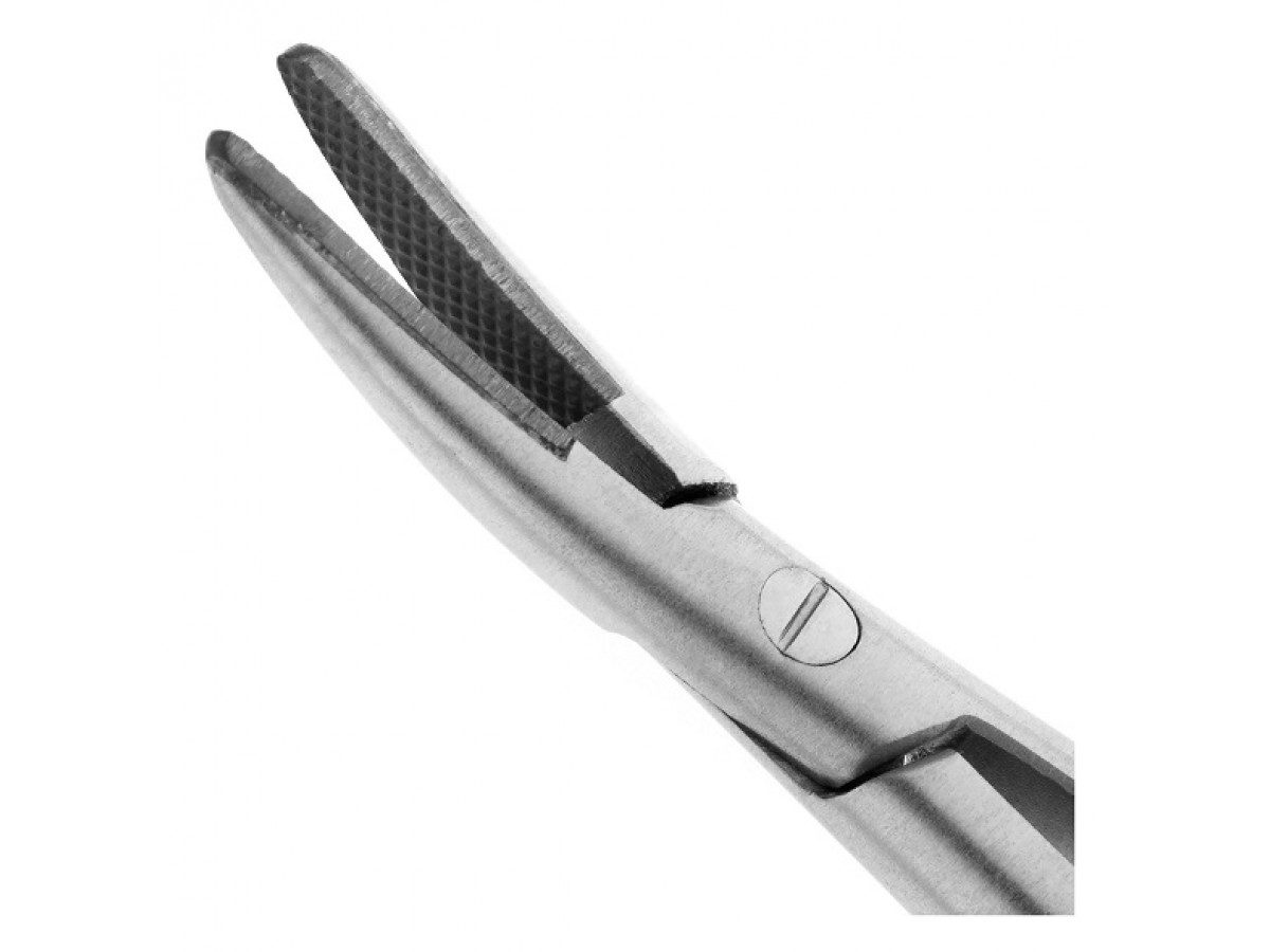 - Рабочие поверхности инструмента имеют вставки из твердого сплава карбид-вольфрама, которые обеспечивают повышенную устойчивость к истиранию. Насечки на внутренней поверхности щечек препятствует скольжению иглодержателя по плоскости хирургической иглы. Изгиб по плоскости в рабочей части позволяет использовать инструмент на труднодоступных участках полости рта, не беспокоясь о том, что иглодержатель закроет обзор.
