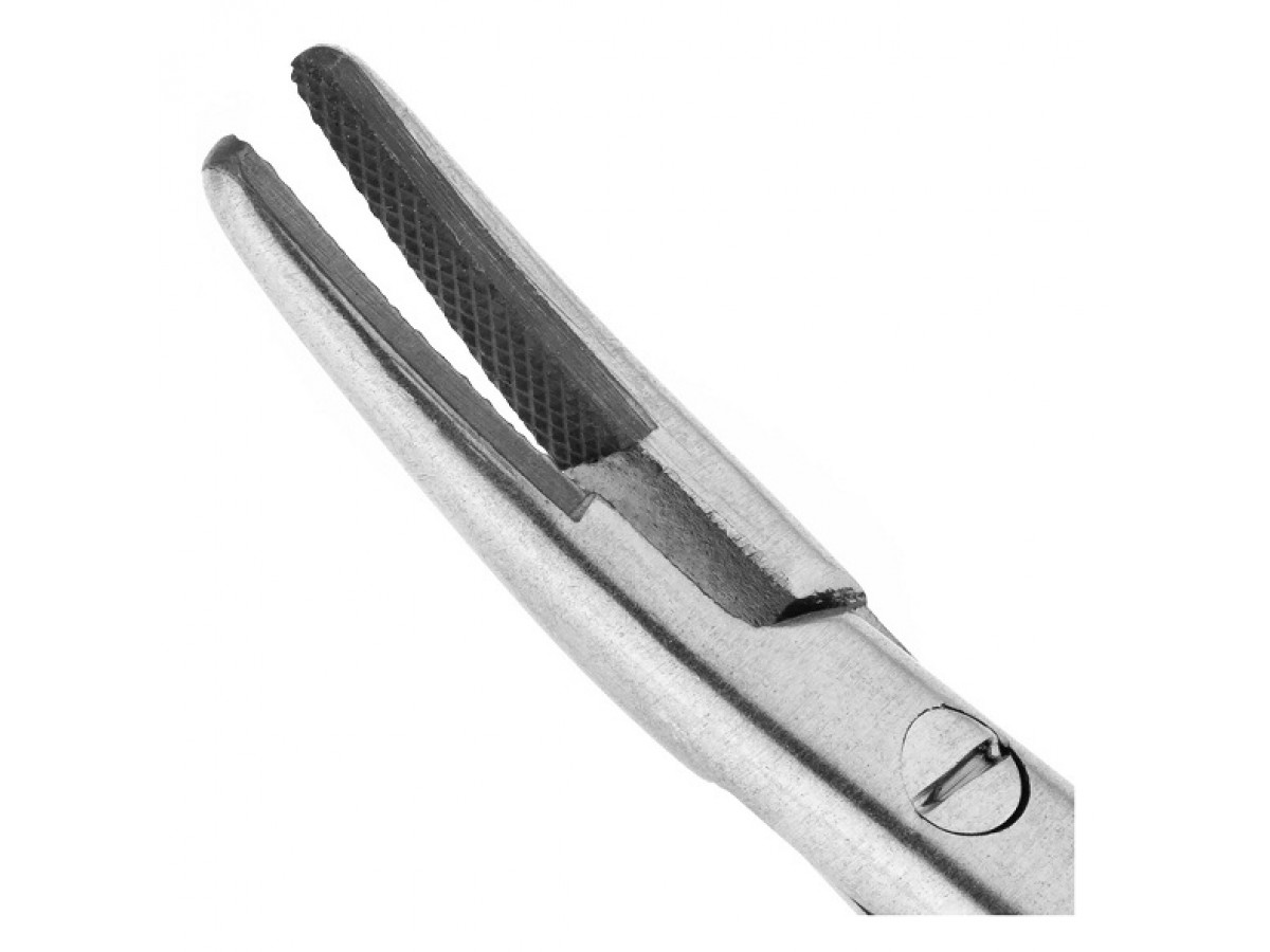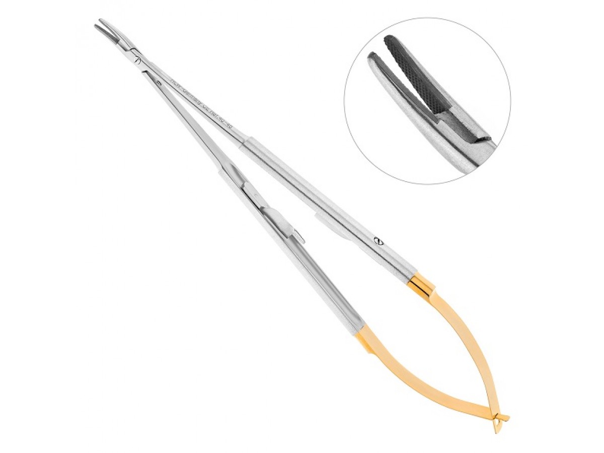 - Рабочие поверхности инструмента имеют вставки из твердого сплава карбид-вольфрама, которые обеспечивают повышенную устойчивость к истиранию. Насечки на внутренней поверхности щечек препятствует скольжению иглодержателя по плоскости хирургической иглы. Изгиб по плоскости в рабочей части позволяет использовать инструмент на труднодоступных участках полости рта, не беспокоясь о том, что иглодержатель закроет обзор.