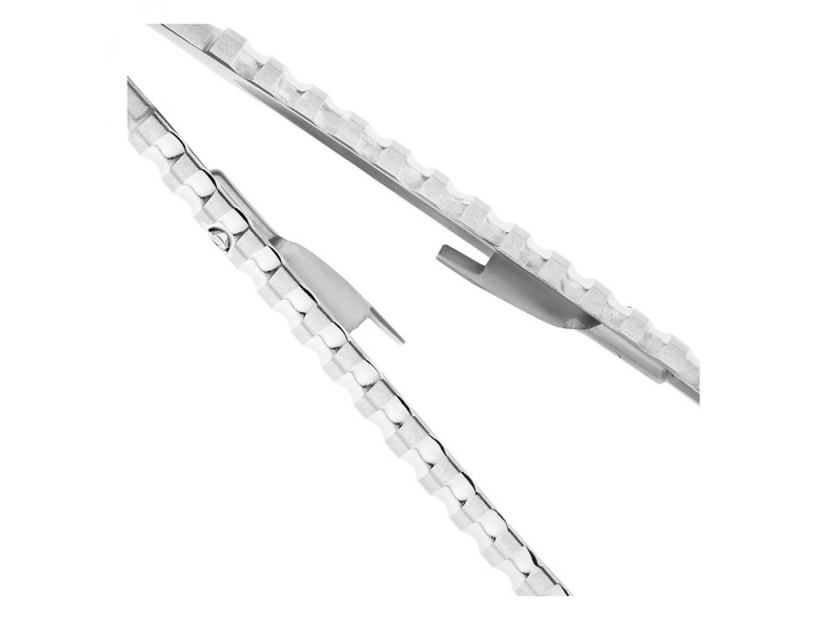 - Рабочие поверхности инструмента имеют вставки из твердого сплава карбид-вольфрама, которые обеспечивают повышенную устойчивость к истиранию. Благодаря крестообразным насечкам на внутренних поверхностях щечек иглодержатель надежно фиксируется и не скользит по плоскости хирургической иглы при наложении шва.