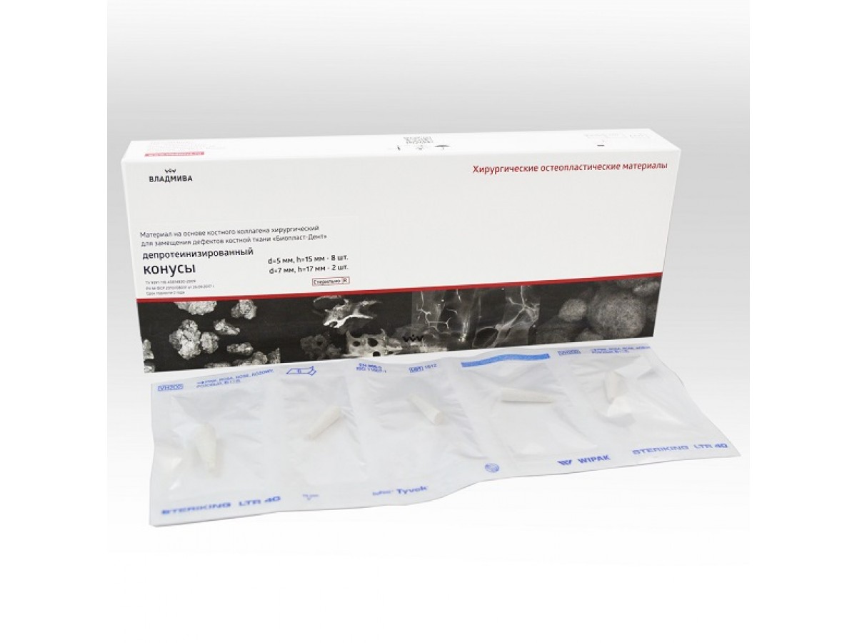 Биопласт-Дент депротеинизированный, конусы - редназначены для восстановления структурной целостности костных дефектов и повышения остеогенного потенциала костной ткани в хирургической стоматологии и челюстно-лицевой хирургии. Производитель: ВладМива, Россия.