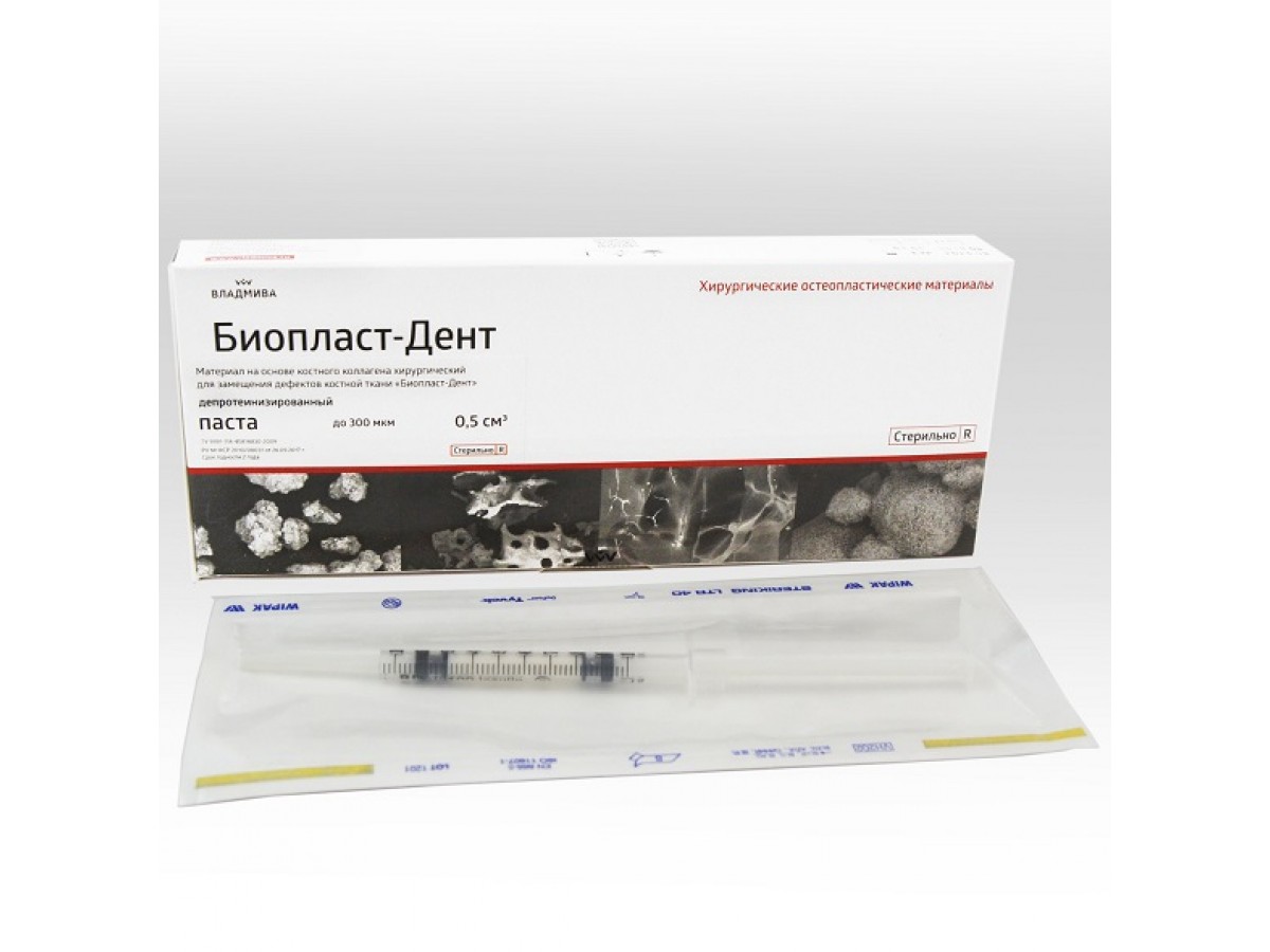 Биопласт-Дент депротеинизированный, паста - предназначена для восстановления структурной целостности костных дефектов и повышения остеогенного потенциала костной ткани в хирургической стоматологии и челюстно-лицевой хирургии. Производитель: ВладМива, Россия.