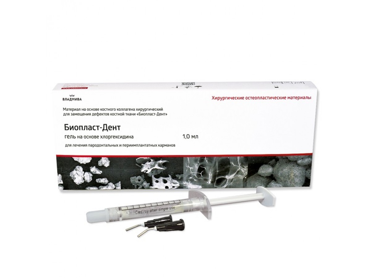 Биопласт-Дент гель на основе хлоргексидина - предназначен для лечения пародонтальных и периимплантатных карманов после механического удаления отложений. Производитель: ВладМива, Россия.