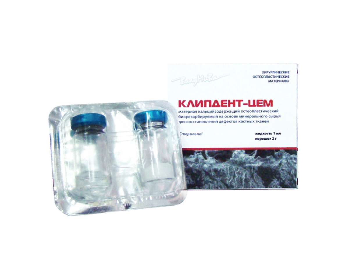 - Биоматериал «Клипдент-Цем» обеспечивает плотный контакт между костью и поверхностью дентального имплантата, способствет формированию новой аутогенной костной ткани, а также препятствует врастанию мягких тканей, являясь эффективной заменой традиционной комбинации «гранулированный материал-мембрана». Прочность затвердевшего материала эквивалентна прочности губчатой кости.