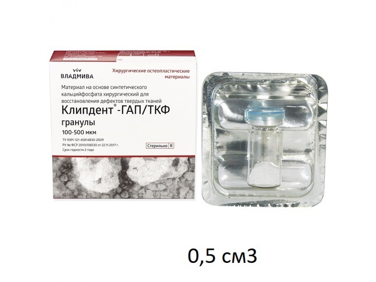- Гранулы для костной регенерации «Клипдент»: на основе чистой фазы β‑трикальцийфосфата; на основе β – трикальцийфосфата (60 %) / гидроксиапатит (40 %), изготовлены в результате спекания синтетического сырья, не содержат веществ животного происхождения, биологически совместимы с тканями организма. Гранулы обладают высокой микро-, макро- и межгранулярной пористостью, что создаёт идеальные условия для восстановления кости.