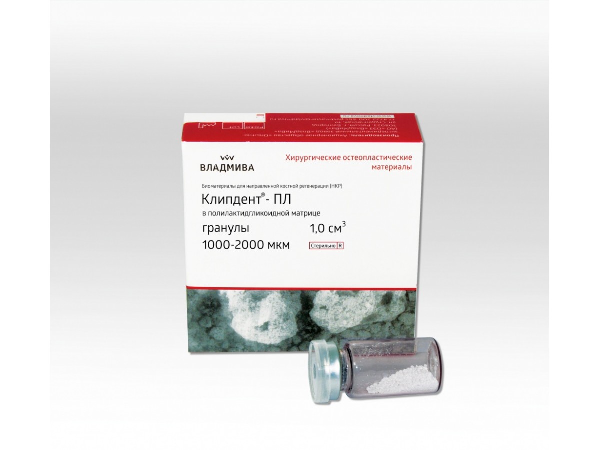 - Материал «Клипдент-ПЛ» выпускается в комплекте с сорастворителем или мембраной. При смешивании гранул с сорастворителем материал становится пластичным и удобным для внесения в место дефекта. После контакта с кровью или ротовой жидкостью материал уплотняется, пакует дефект, облегчая процедуру ушивания раны. Резорбция протекает параллельно процессу регенерации.
