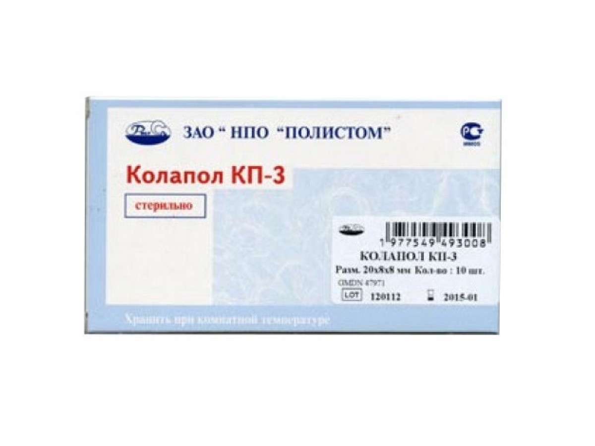 - Характеризуется биосовместимостью с тканями человека и не вызывает реакции отторжения. КОЛАПОЛ КП-3 усиливает остеогенез и стимулирует заживление раны в костных тканях.