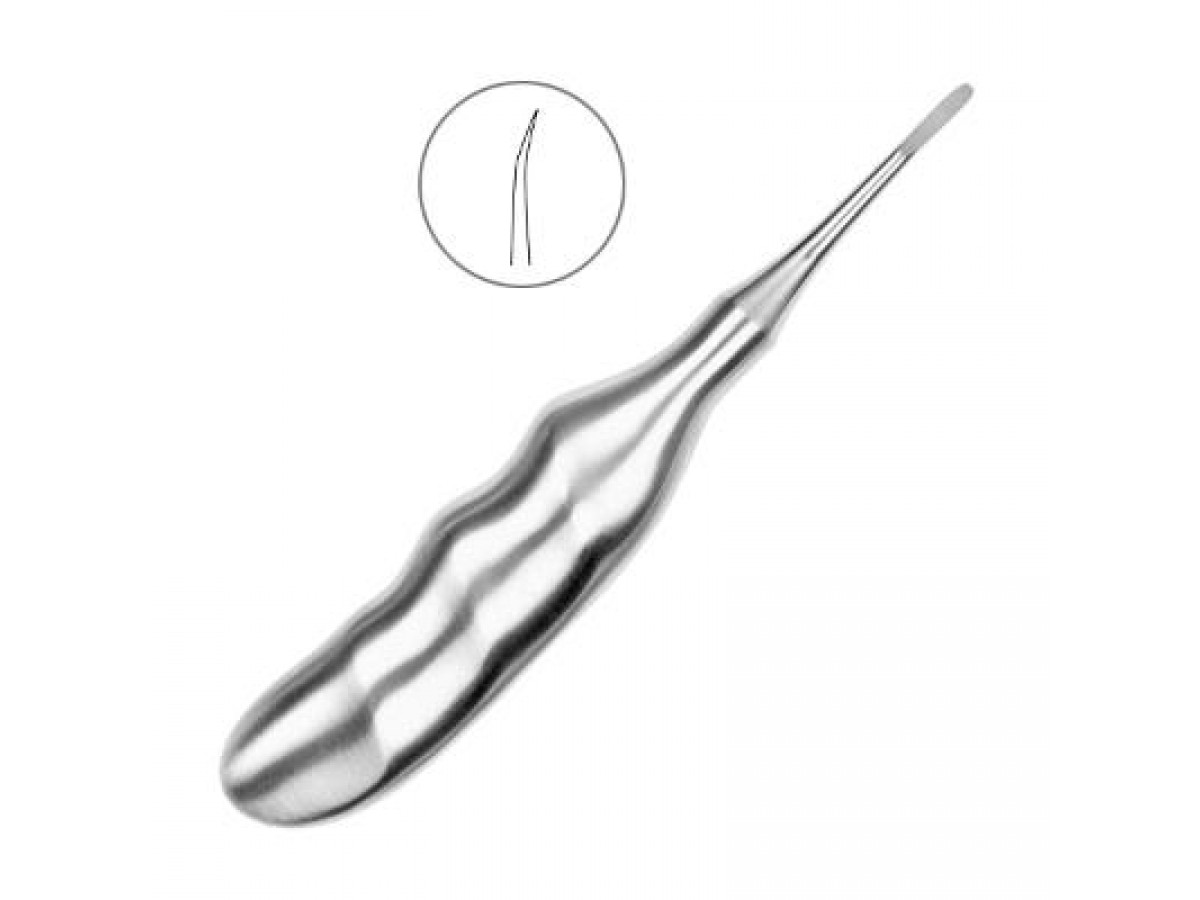 - Люксатор имеет одиночный изгиб по плоскости между соединительным стержнем и рабочей частью, благодаря которому инструмент легко проникает в глубоко расположенные участки полости рта.