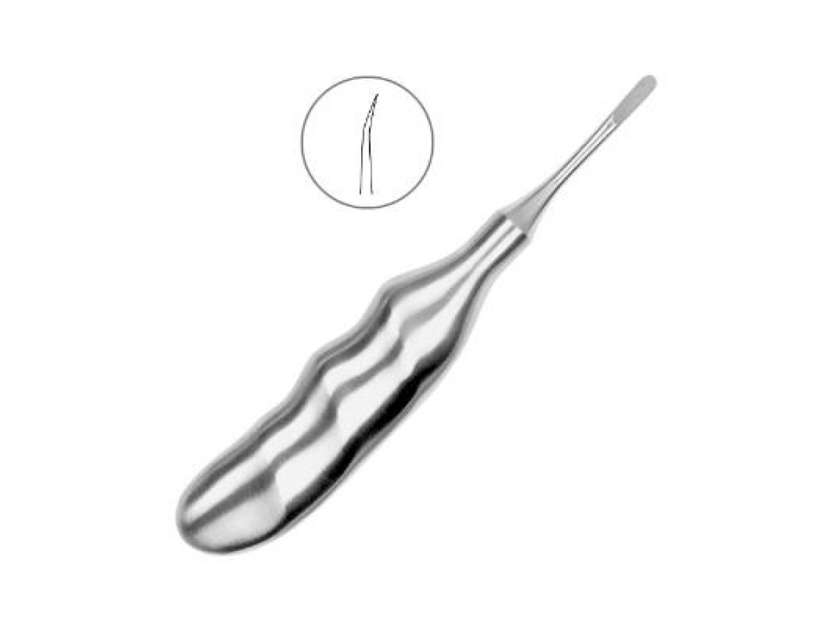 - Люксатор в основании рабочей части имеет одиночный изгиб по плоскости, благодаря которому инструмент можно глубоко ввести аксиально между корнем зуба и костной тканью лунки.